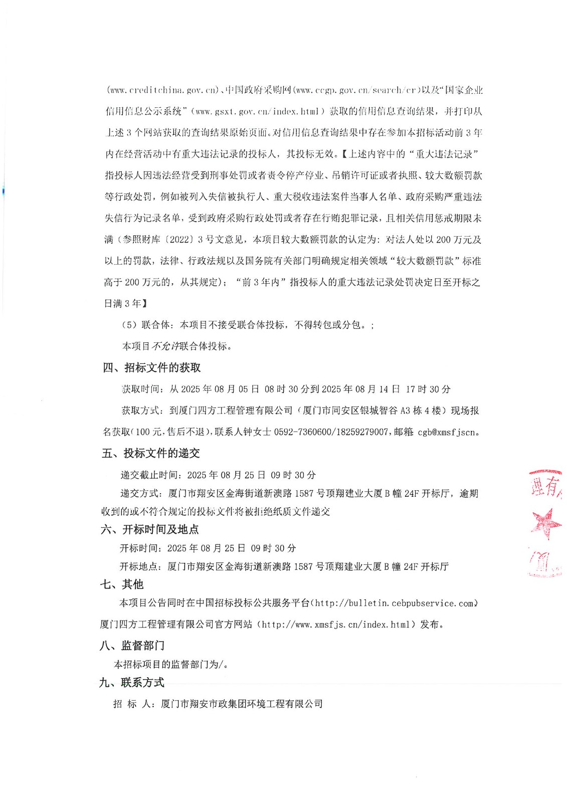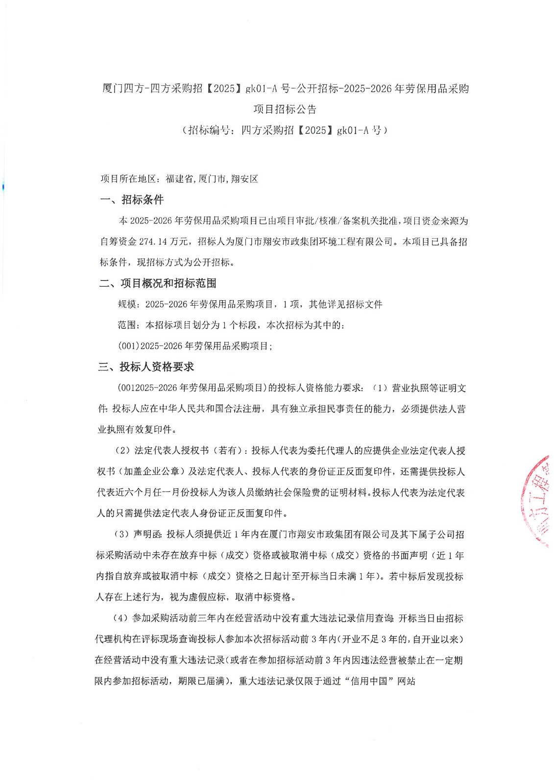 厦门四方-四方采购招【2025】gk01-A号-公开招标-2025-2026年劳保用品采购项目招标公告