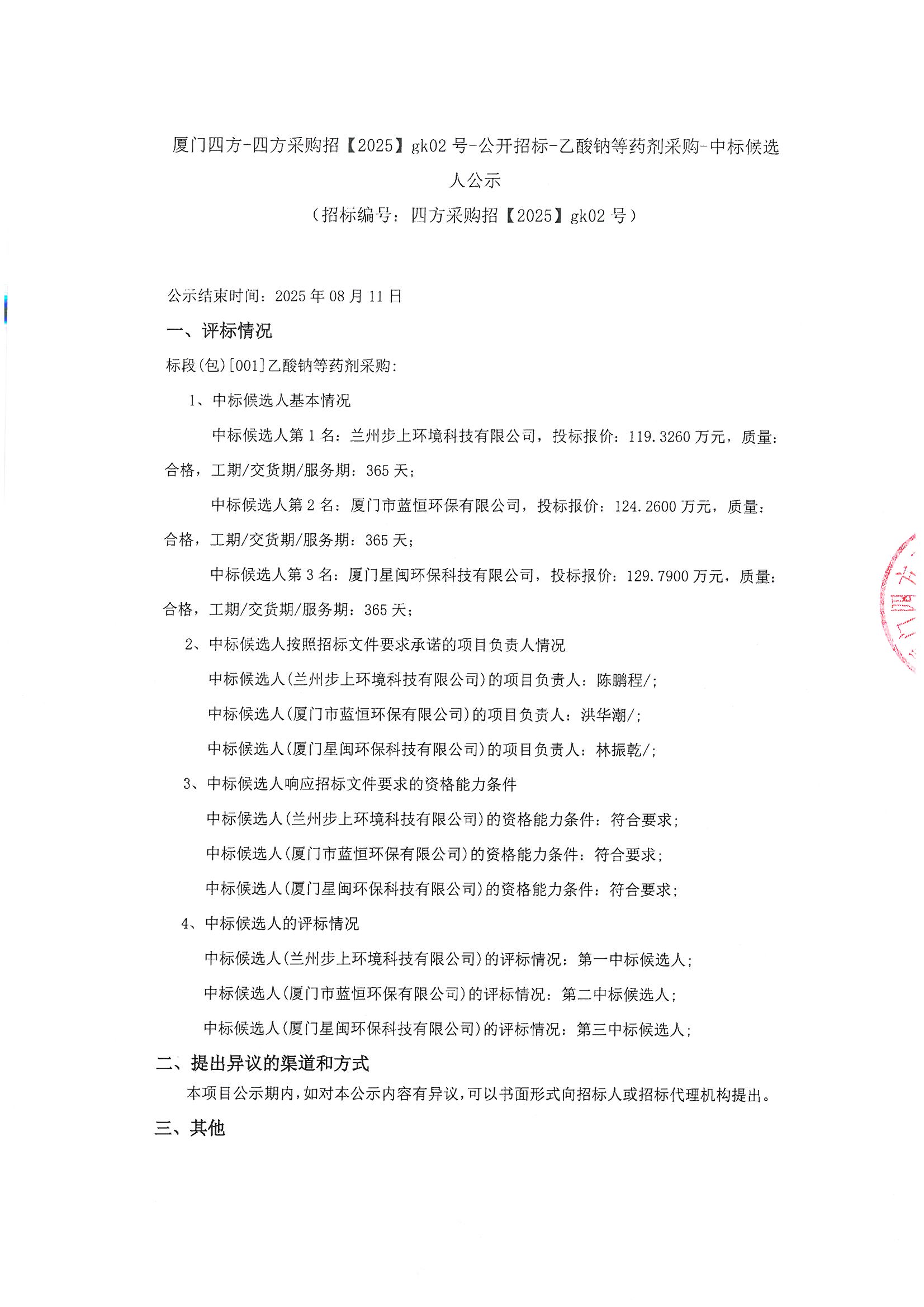 厦门四方-四方采购招【2025】gk02号-公开招标-乙酸钠等药剂采购-中标候选人公示
